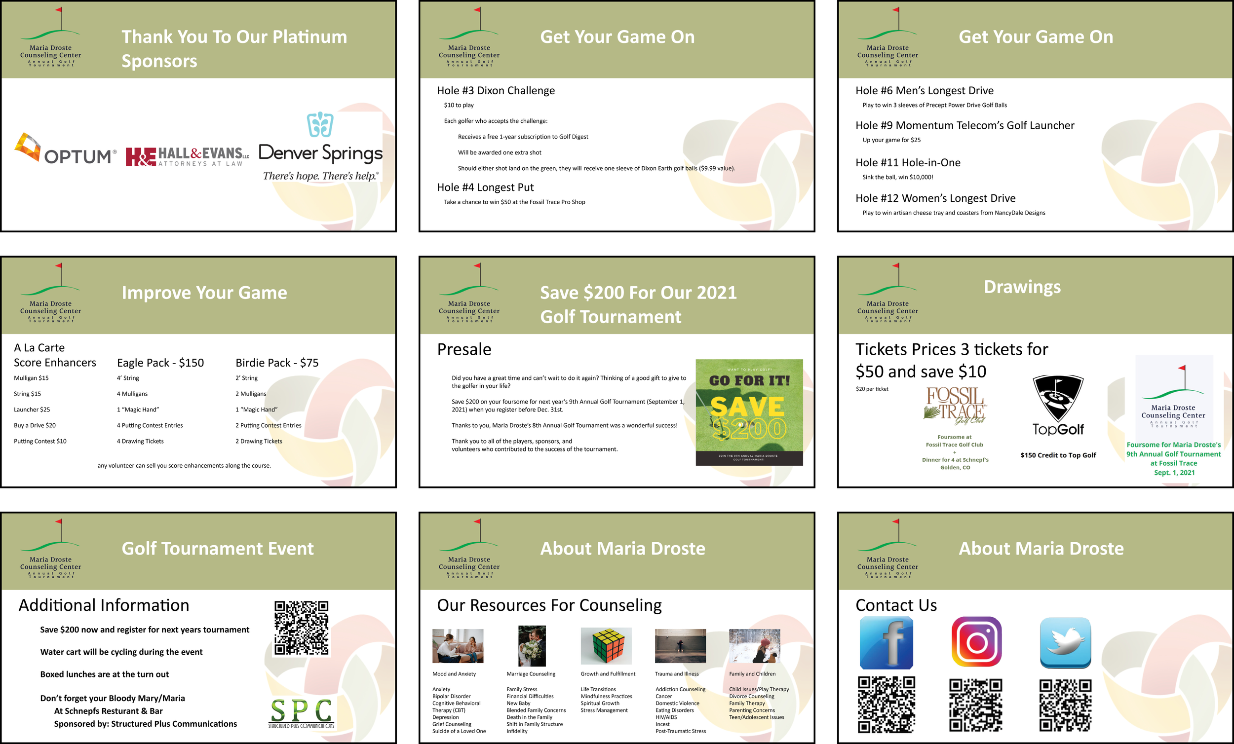 For the same golf event for Maria Droste, I was also tasked with designing sliders that will be played on large tv screens through out the duration of the event. These screens were placed around the event ground and would cycle through these sliders. The sliders will go through information of the event, lunch information, promotion for Maria Droste, and thank you to our sponsors. I created at least 20 different sliders for this event.